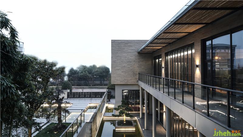 如何在原稍顯陳舊的工業(yè)園區(qū)中打造一個(gè)富有有時(shí)代性與國(guó)際視野的企業(yè)形象是我們執(zhí)筆前考慮的重中之重。通過(guò)對(duì)企業(yè)的內(nèi)部功能需求,不同區(qū)域?qū)θ照招枨蟮姆治黾翱茖W(xué)合理的交通動(dòng)線規(guī)劃,圍繞著水院,在功能上由南向北劃分了辦公樓、企業(yè)接待會(huì)所、企業(yè)管理中心、倉(cāng)儲(chǔ)中心。通過(guò)建筑BOX的巧妙穿插、抬高、挖空、切割,用雕塑的手法構(gòu)造出“堆山式”的建筑,使整體的建筑空間既有良好的采光又有和而不同的形態(tài)韻律之美。庭院水系的取巧劃分,給來(lái)賓一番有別于常規(guī)工廠慣性認(rèn)知,恍如邁入一個(gè)生態(tài)自然的文創(chuàng)院落。由東向西的建筑抬地處理讓視野通達(dá),富有層次之美。