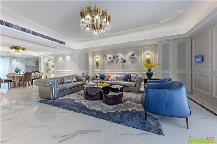 純白色的主基調(diào)上,用灰色的壁紙和藍(lán)色的配飾進(jìn)行調(diào)和與碰撞。時(shí)尚現(xiàn)代的灰色皮質(zhì)沙發(fā)和金屬燈飾的搭配,放在整個(gè)空間中,卻又讓人覺得很和諧。
