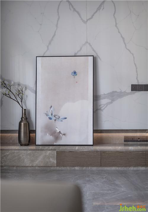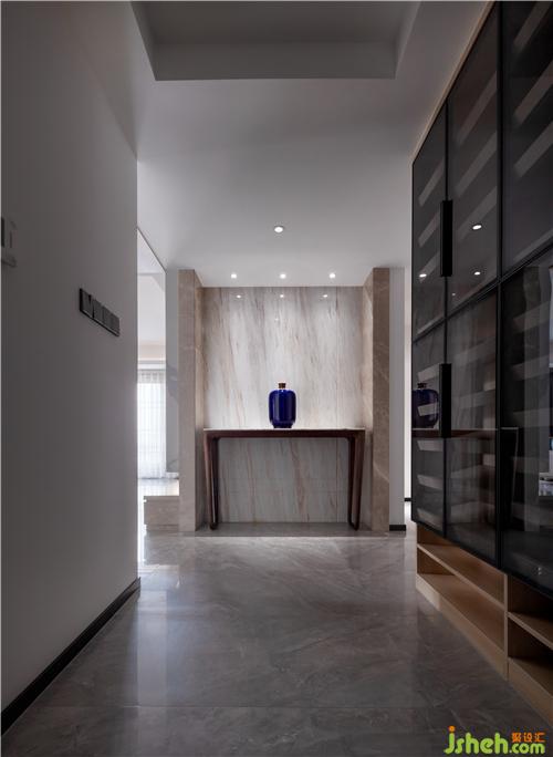 進(jìn)門(mén)鞋柜運(yùn)用了黑色玻璃門(mén)和金屬線條,與玄關(guān)大理石在空間質(zhì)感的碰撞,于細(xì)節(jié)處體現(xiàn)出不同材質(zhì)表達(dá)一種低沉、高雅、個(gè)性。裝修公司