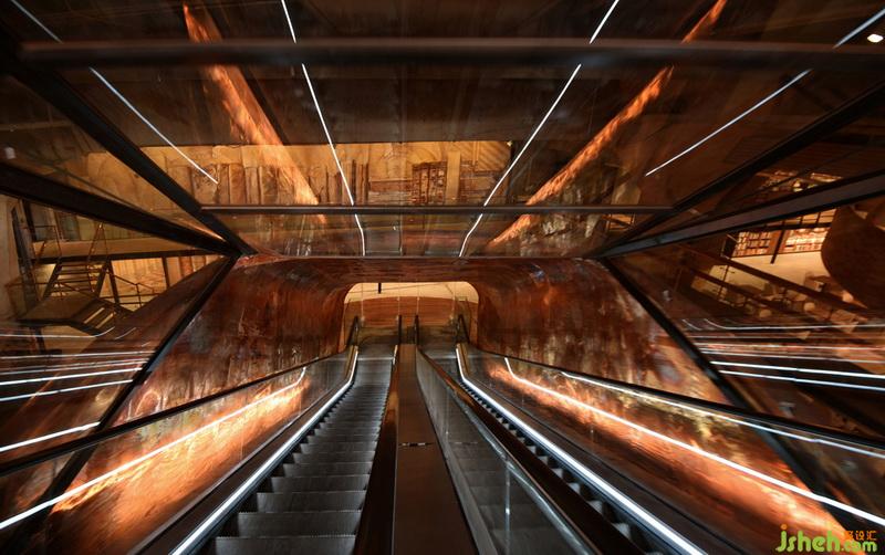 書收納古今中外的歷史和智慧,根植于人類已知的世界,求索未來。所以在整個空間里運用了星球運行圖、星座元素來增加浩瀚的宇宙視野。臺灣設(shè)計師朱志康在空間設(shè)計上面運用了很多高壓后釋放的設(shè)計手法,讓人體會通過神秘隧道進入圣殿的感動!
