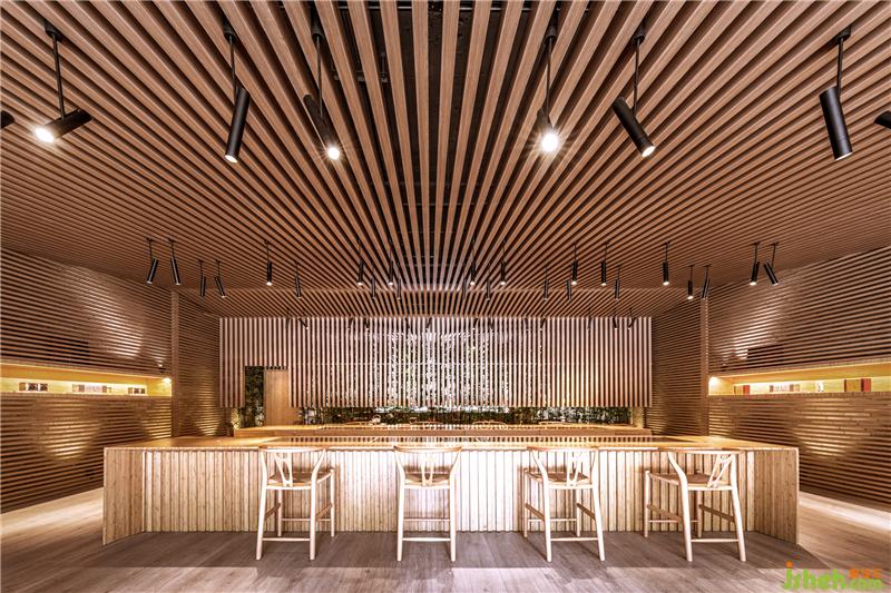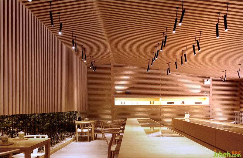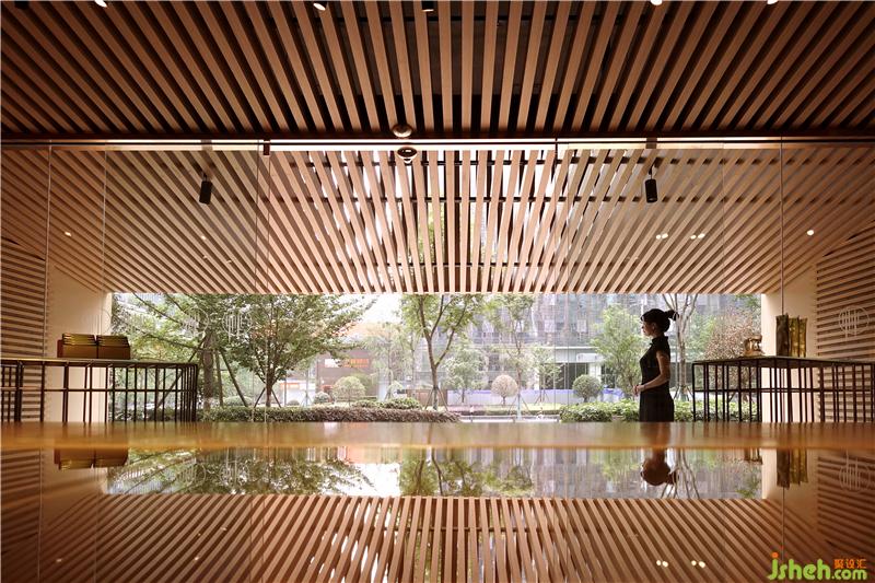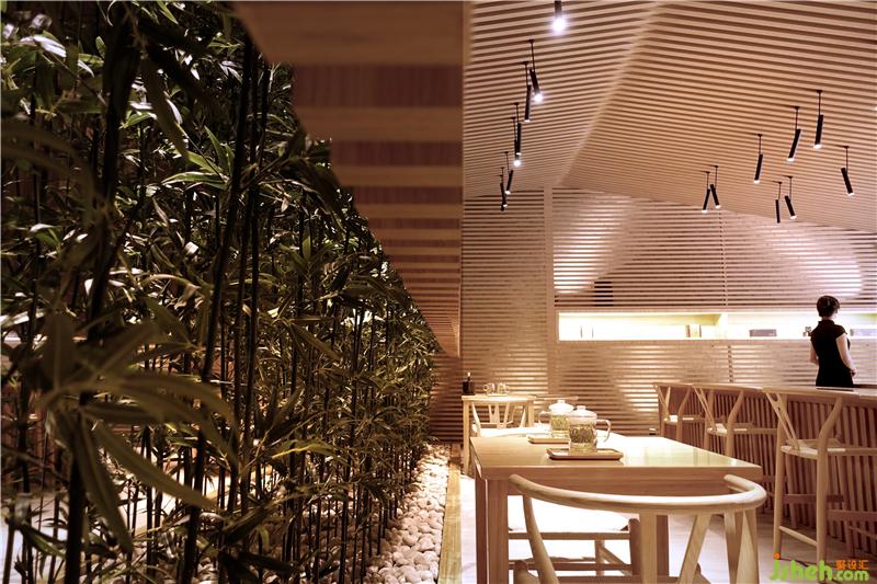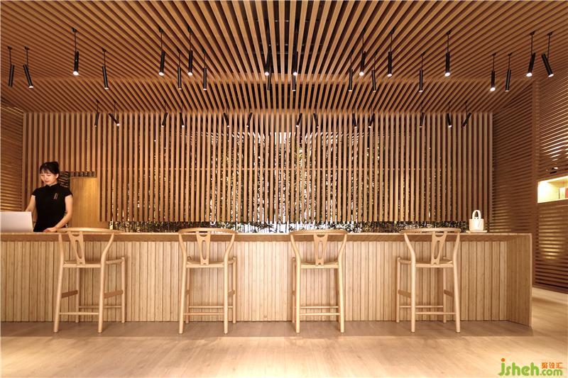 竹葉青的產(chǎn)品種類是精選過的,并不繁雜,因此我們縮小了商品展示空間的比例,而著重在人與人之間的互動。悠閑的生活步調(diào)是大家對成都人的印象之一,另一個印象就是在庭院中喝著用蓋碗杯泡的竹葉青茶。過去十多年,竹葉青在品牌的塑造上并沒有強(qiáng)調(diào)”怎么喝竹葉青茶”這件事,我們現(xiàn)在把它強(qiáng)調(diào)出來,創(chuàng)造喝茶的氛圍。同時我們也把竹子帶入店內(nèi)空間,竹子也是大眾對四川的一個普遍印象;店鋪設(shè)計我們也在竹子格柵的設(shè)計上著墨,將其發(fā)揮得淋漓盡致。店鋪設(shè)計