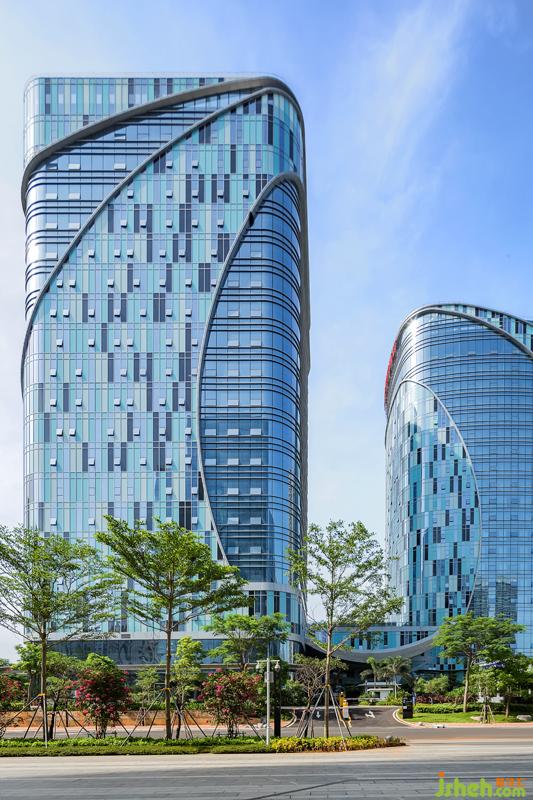 酒店的整體外觀是由藍(lán)色玻璃設(shè)計(jì)而成,是設(shè)計(jì)師從當(dāng)?shù)氐臑I海文化中提取靈感。以海浪為設(shè)計(jì)理念,通過(guò)抽象、提取、演變的過(guò)程,以藍(lán)色為基調(diào),將海浪起伏的動(dòng)感形象運(yùn)用到酒店的外觀,創(chuàng)造出了壹種“海天相映,連綿起伏”的錯(cuò)落層次。