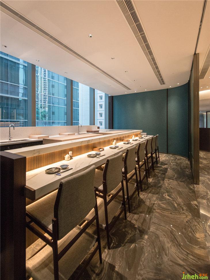 在設(shè)計(jì)選材上,所選用的材料都隱晦地包含著日式元素,如在地磚的選材上,壽司吧臺(tái)區(qū)選用進(jìn)口意大利地磚的靈感,來(lái)源于日本浮世繪的波浪圖案筆觸,搭配墻板和家具再配上煙熏尤加利木,演繹古代日式建筑的和風(fēng)深咖色調(diào)。