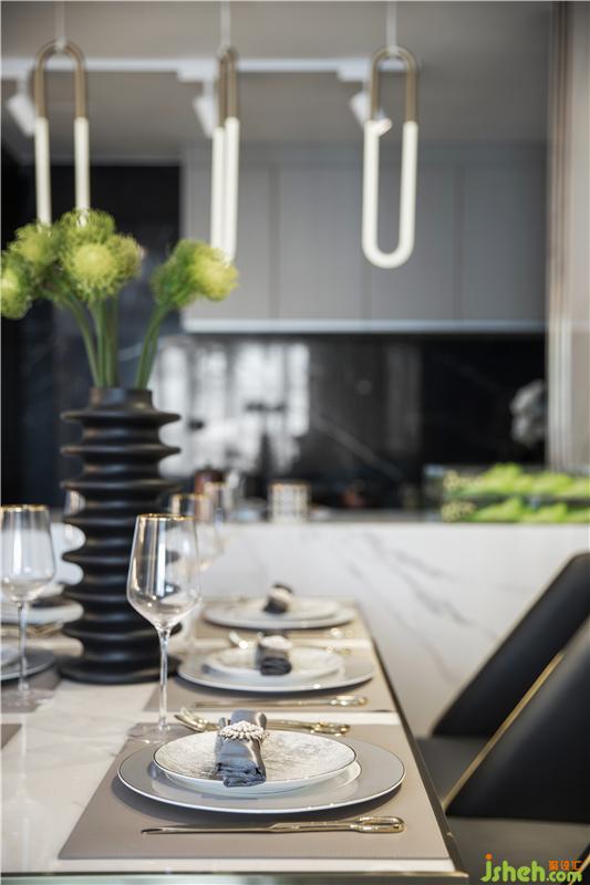 取其精髓,打造輕奢主義風(fēng)格,不限制于任何裝修元素與色彩。本案中運(yùn)用姜黃色、魅影黑、翠綠色、太妃糖色,古沙色、水晶玫瑰色,縱橫交錯(cuò)于爵士白大理石、干邑色金屬條各種觸感的材質(zhì)里。家具使用黑檀木皮、按樹瘤木皮多層處理,布藝黑灰色千鳥格紋,飾品物料烤瓷白、爵士白大理石、黑金沙大理石,經(jīng)過各種豐富材質(zhì)自行創(chuàng)新,讓空間氛圍更加多元化。摒棄了過多的約束,擺脫了沉悶的裝修格局,讓空間更加開放。