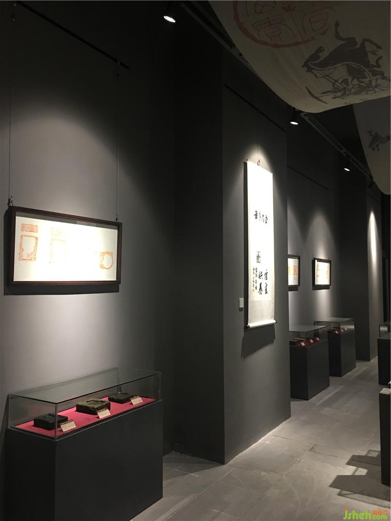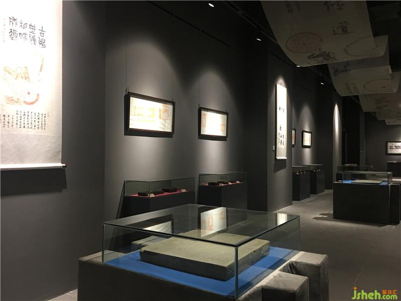 序廳區(qū)通過(guò)灰色肌理漆、老木板及竹子和梅花城墻造型來(lái)體現(xiàn)“天下梅花兩朵半,半朵梅花在嚴(yán)州”的主題。金石展廳通過(guò)噴砂布做頂面造型,墻面深灰色藝術(shù)涂料打造展廳昏暗空間,配合木飾面及硬包展柜展示金石及銘文磚藏品。