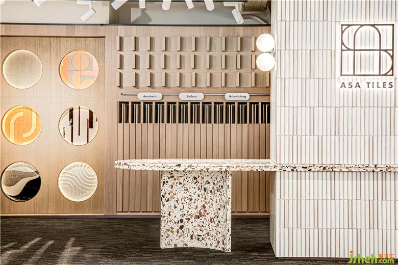 入口處醒目的LOGO,提示消費者已進入ASA展覽時空,瓷磚展廳設計整體的暖色調(diào)出營造有氧商業(yè)空間氛圍,拉近消費者與空間、品牌、產(chǎn)品的距離。