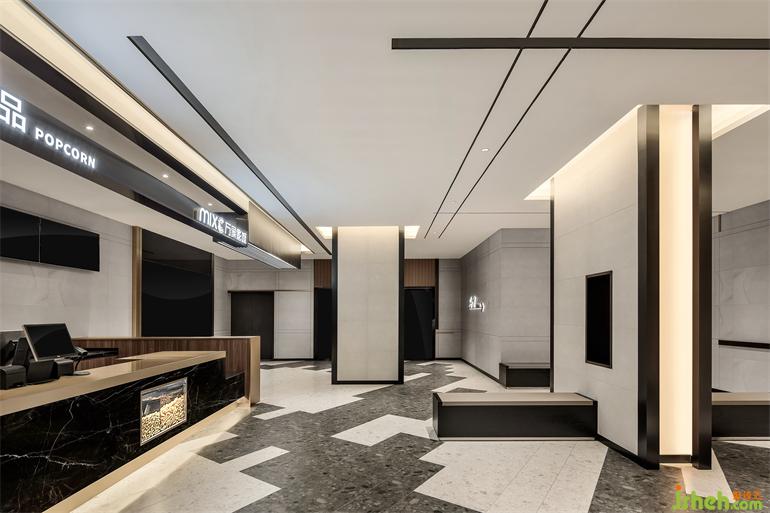 當(dāng)通過電梯抵達二樓,天花上無限延展的黑線和鋁條,影城設(shè)計不僅形成更為立體的視覺,還構(gòu)成了視覺引導(dǎo),線與面的幾何設(shè)計始終貫穿整個影院。
