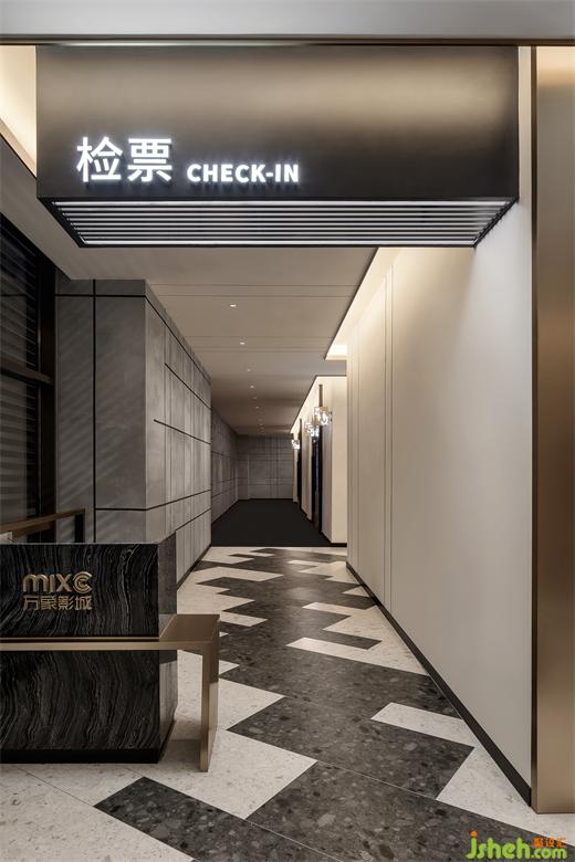 走廊同樣由線與面這兩個基本元素構(gòu)成,鋁板和噴漆板是不規(guī)則的線,影城設(shè)計緊貼著原本枯燥的墻面。