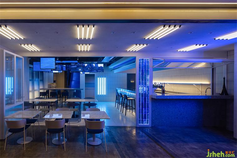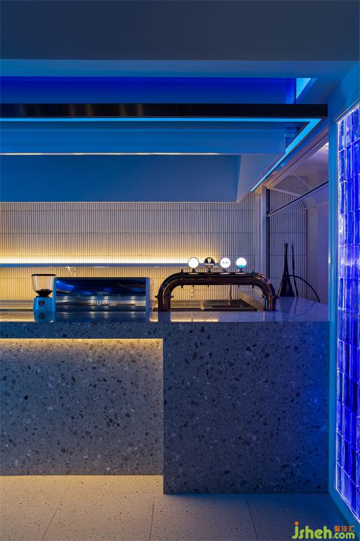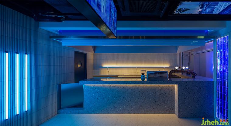 在空間邏輯上,OFT設(shè)計(jì)用“自下而上”、“循序漸進(jìn)”的酒吧設(shè)計(jì)手法連接兩層空間;在視覺上,藍(lán)白兩種冷色則以一種最直接的方式,將賽博朋克風(fēng)格中的冷峻與科幻發(fā)揮到極致。