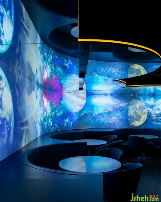 一排規(guī)則排列的燈管與L形吧臺(tái)形成上下對應(yīng)關(guān)系,確保空間的完整、流暢;墻面的圓形鏡面帶來放大空間的效果,也暗示宇宙中其他星球的存在。