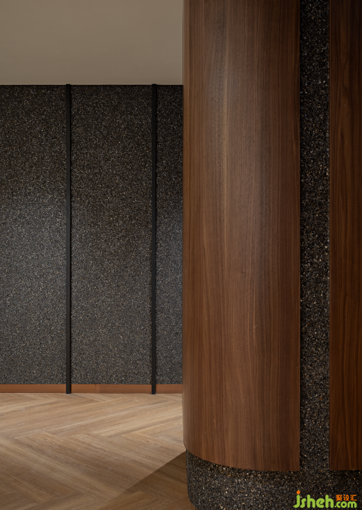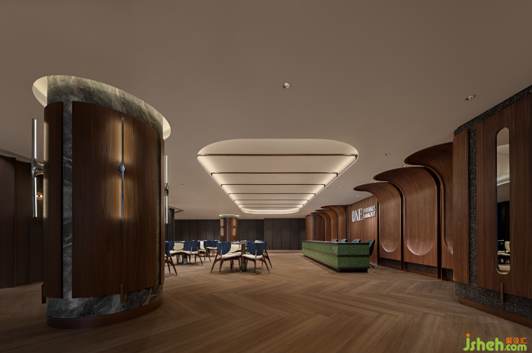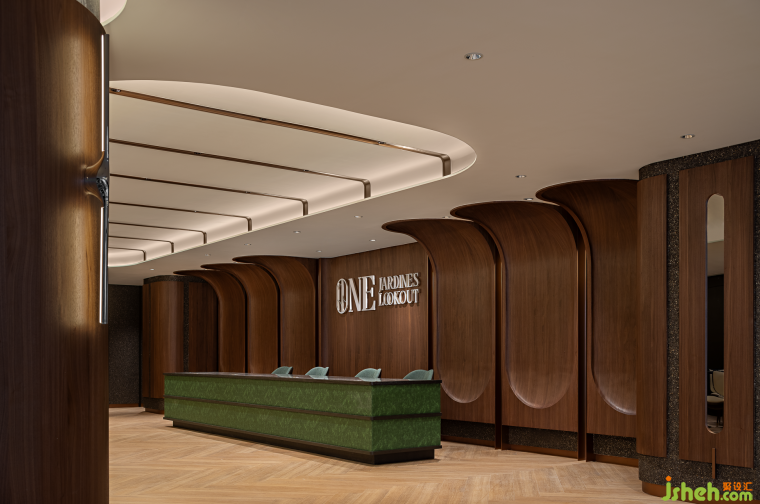 除了功能性,在設計細節(jié)上,同樣經(jīng)得起推敲,空間中不同材料相互映照,隱喻中西文化在此交匯,生長出新的文化精神與內(nèi)核。而突破兩個平面規(guī)則的墻面造型,則預示著英皇地產(chǎn)不斷尋求突破與創(chuàng)新的品牌發(fā)展軌跡。