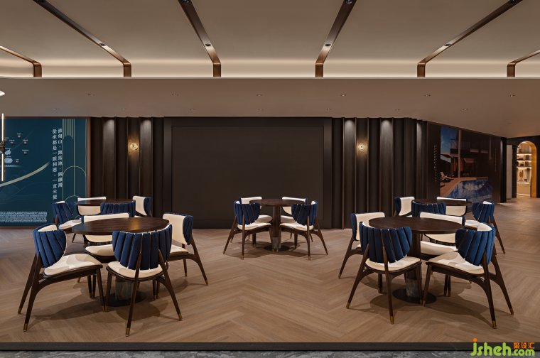 相較于前期路線的探索感,洽談區(qū)更為開闊,環(huán)繞式的設計也令整個空間更具安全感與穩(wěn)定感,促使購房者完成坐下交流的動作。