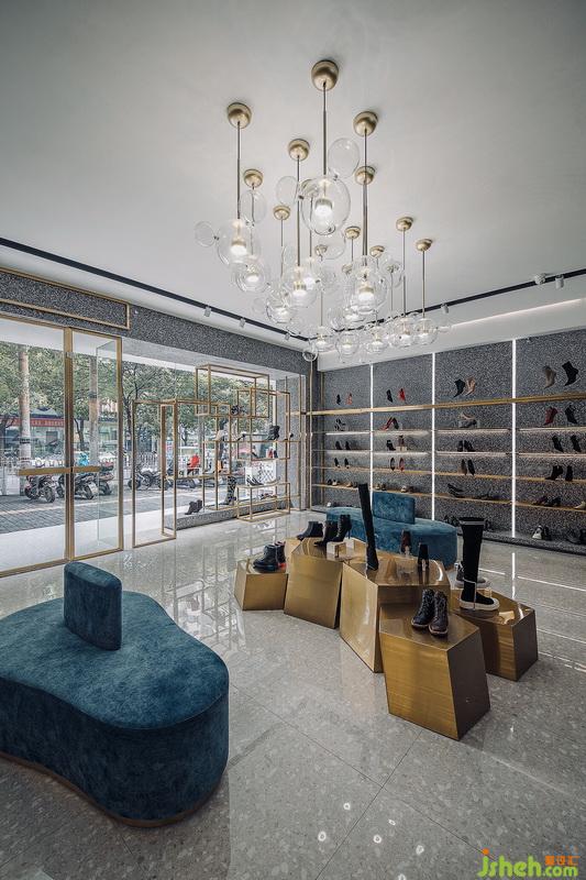 EUSANZZO店升級為采用高級灰色系統(tǒng)和鈦金色金屬材質(zhì)的點綴貫穿整個空間,使80平方米的空間更具國際時尚感。