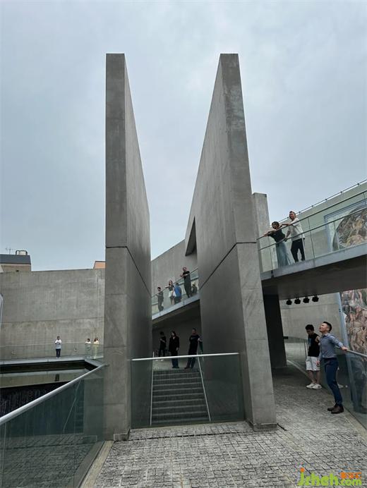 清水混凝土、水 、陶板畫是整個建筑中出現(xiàn)得最多的元素,他們各自承擔(dān)了不同的職能,卻又相互融合、搭配,缺一不可。清水混凝土作為支撐結(jié)構(gòu)及外維護結(jié)構(gòu)材料,其出現(xiàn)的結(jié)構(gòu)意義被縮小,取而代之的是其對于空間及視線的限定。這樣的處理方式使得用地在有限的范圍內(nèi)產(chǎn)生了多個處于并置關(guān)系的空間,并增加了陶板畫相互融通卻又相對獨立的展陳位置。