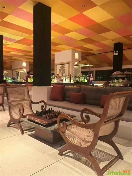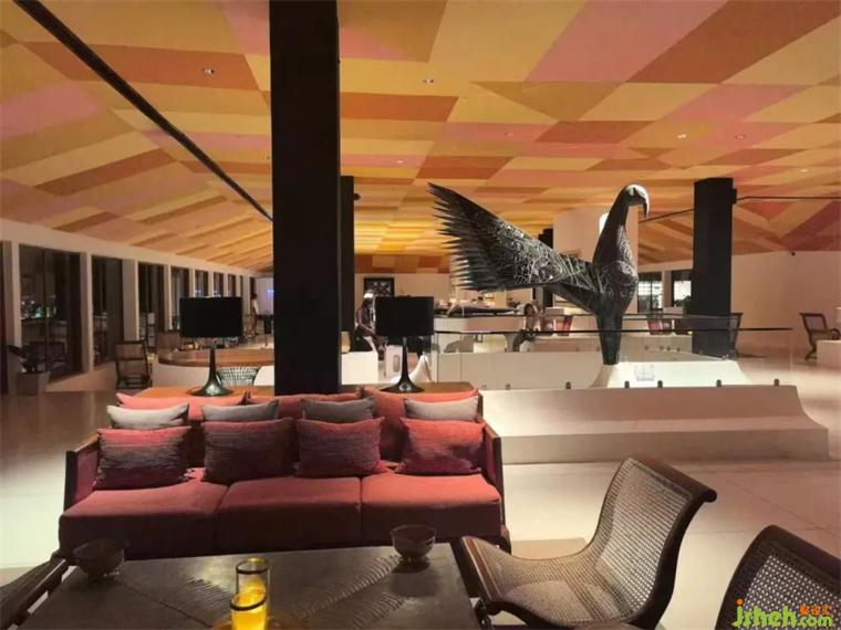 基座層是由毛石砌筑而成的“堡壘”,內(nèi)部空間有種厚實(shí)的洞穴感。二層是以四面圍合的水庭院為中心的公共區(qū)域,這一層的陳設(shè)設(shè)計(jì)得非常適度,繁復(fù)而不油膩。三層往上則是層層向外懸挑的客房區(qū)域,舉重若輕地漂浮。裝修設(shè)計(jì)