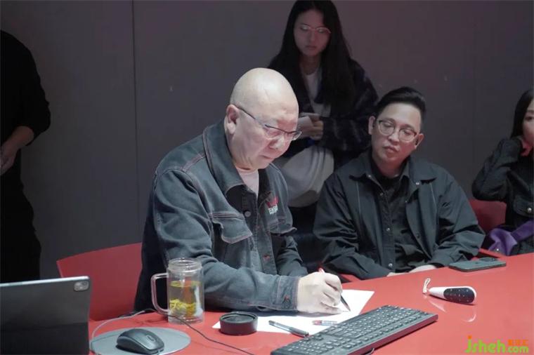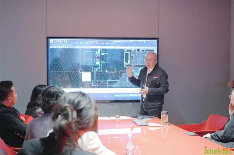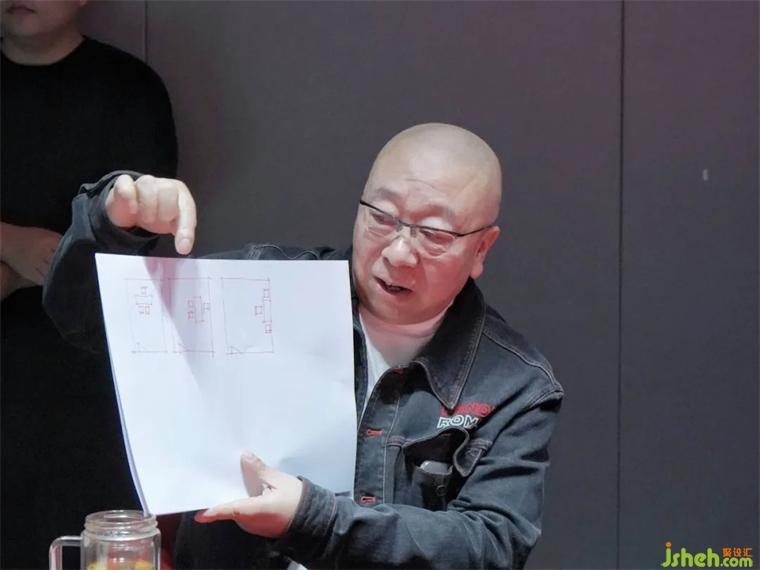 在極具線條感的紅色長桌上,孫天文現(xiàn)場畫圖,用桌椅布局講如何營造客房的親切感,強調做設計要進行深度思考。在黃山西遞酒店的案例分享中,孫天文設計了強烈的疏密關系,打破原有的水池格局,用不平衡的分布突出空間的重心;在明暗變換的加持下,蜿蜒的連廊營造出“曲徑通幽”、“不識廬山真面目”的意境。