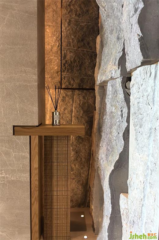 離開(kāi)公共區(qū)我們走向樣板間,在入戶門的位置,設(shè)置了專屬于業(yè)主的鎮(zhèn)宅位,玻璃壁龕可放置業(yè)主私人藝術(shù)收藏。室內(nèi)約3.15米的層高讓整個(gè)空間顯得更加開(kāi)闊大氣。三面采光的設(shè)計(jì),使得室內(nèi)光線充足,擁有出眾的景觀和視野。在材質(zhì)方面,地面選用天然奢石-寶格麗蘭,十字拼接,西廚及壁爐選用經(jīng)典法式奢石-山水白;在設(shè)計(jì)手法上,配置石材踢腳、墻面線條與疊級(jí)等西方古典語(yǔ)言,營(yíng)造輕法風(fēng)情。
