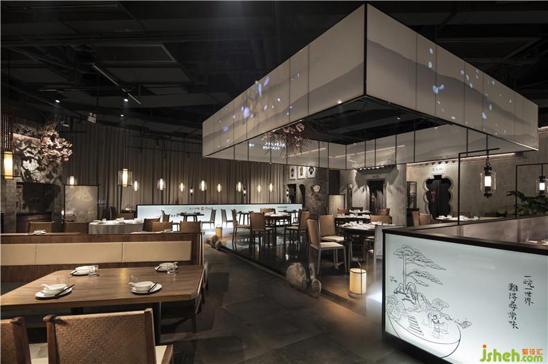 作品簡介:皖廚桃花潭外立面運(yùn)用整面玻璃燈光外墻,國畫寫意結(jié)合現(xiàn)代燈光設(shè)計(jì),繪制抽象徽派建筑線條。餐廳內(nèi)沿用徽派建筑馬頭墻墻體,并于高地懸掛紗幔以聲光電技術(shù)投影桃花瓣飄落場景,室內(nèi)多以中式園林框景手法結(jié)合燈光設(shè)計(jì)繪制陰翳感,金磚地面營造出水的倒影,拉伸空間的維度。