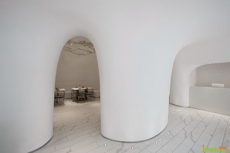 作品簡介:這是一家以海南椰子和文昌雞為特色的火鍋店。設(shè)計(jì)師用最純粹的手法,營造出了充滿想象和驚喜的餐廳環(huán)境。設(shè)計(jì)的靈感源于椰果,步入空間,立即被這個(gè)巨大的白色“洞穴”吸引,這里完全不像是一個(gè)傳統(tǒng)感覺中的火鍋餐廳,仿佛置身于一個(gè)個(gè)掰開的椰子,奶白色無序圍合的三維曲面,如一片片誘人的椰肉,連綿如洞穴般的造型,渾然一體,讓空間極具張力,從視覺和觸覺上都刺激著食客的神經(jīng),這一切正如主人提供的食材一樣:純粹、天然、健康。